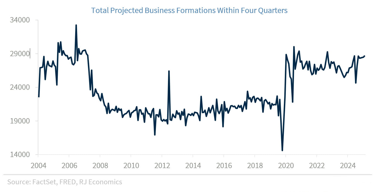 Part of the issue has to do with business formations, which is the estimate the BLS uses to account for job creation by new businesses. As the graph below shows, there was a clear structural shift in business formations after the Great Recession and another structural shift in business formations after the COVID- 19 pandemic, to which BLS statisticians are still trying to adapt their models to capture these changes.